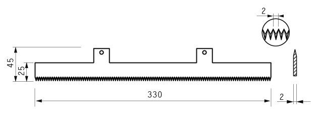 Cuchilla transversal dentada, 330x45/25x2mm, doble bisel dentado ambas caras, paso dientes 2mm